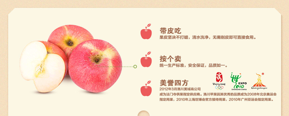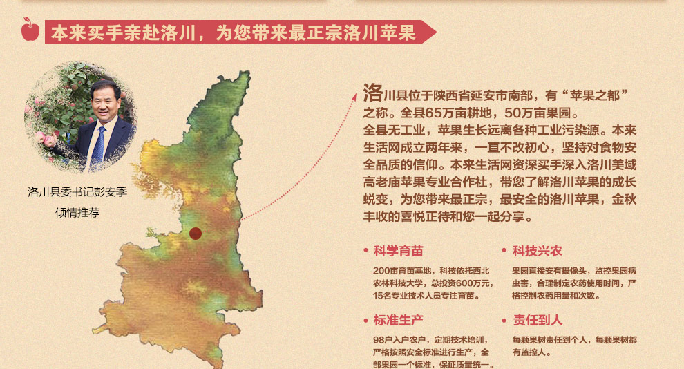 特點(diǎn):果形優(yōu)美,個(gè)大均勻,果面潔凈,色澤艷麗,肉質(zhì)脆密,含糖量高、香甜可口,硬度適中,耐貯藏,全國(guó)同類蘋果之冠。 介紹:陜西洛川蘋果以色香味俱全著稱,洛川縣是中國(guó)蘋果外銷的重要生產(chǎn)基地之一,陜西洛川的蘋果種植面積達(dá)50.8萬(wàn)畝,洛川人均占有蘋果比全國(guó)平均水平高出5倍,洛川蘋果有很多知名優(yōu)良品種,眾所周知的紅富士蘋果就是洛川蘋果的一種,還有紅星、紅元帥、紅冠、國(guó)光、秦冠、黃元帥等;洛川蘋果的品質(zhì)源自陜西黃土高原年均日照2552小時(shí),海拔1100米左右,晝夜溫差大,病蟲害少,有利于蘋果栽培和糖分的積累,洛川出產(chǎn)的蘋果香味濃厚、耐儲(chǔ)存、營(yíng)養(yǎng)價(jià)值高。常吃蘋果對(duì)人體健康有益,除了鮮食,陜西洛川蘋果還可以熟食、研制、干制、烤制,以及加工做蘋果罐頭、蜜餞、國(guó)建等工人享用。
